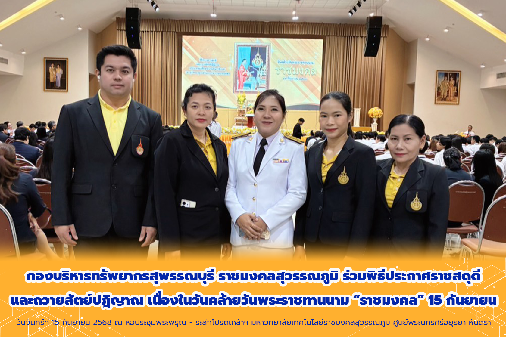กองบริหารทรัพยากรสุพรรณบุรี ราชมงคลสุวรรณภูมิ ร่วมพิธีประกาศราชสดุดี และถวายสัตย์ปฎิญาณ เนื่องในวันคล้ายวันพระราชทานนาม “ราชมงคล” 15 กันยายน | 209 ครั้ง เมื่อ 1 เดือนที่แล้ว