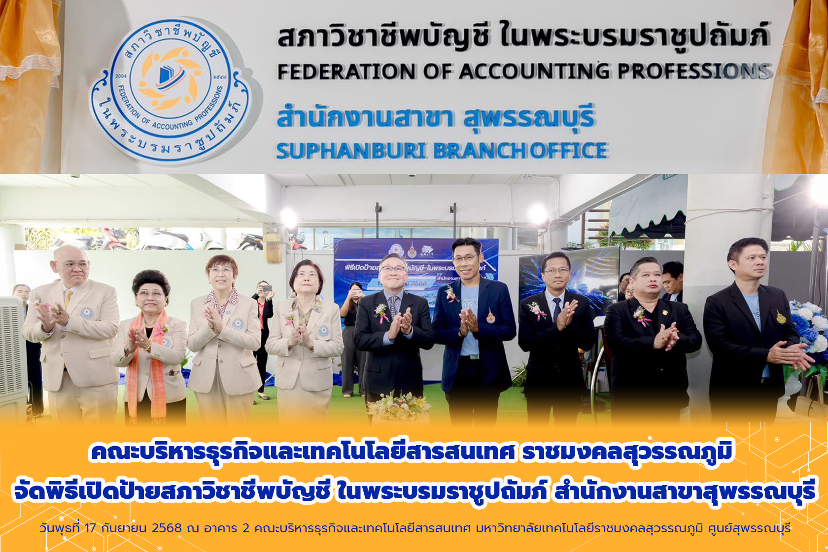 คณะบริหารธุรกิจและเทคโนโลยีสารสนเทศ ราชมงคลสุวรรณภูมิ จัดพิธีเปิดป้ายสภาวิชาชีพบัญชี ในพระบรมราชูปถัมภ์ สำนักงานสาขาสุพรรณบุรี | 282 ครั้ง เมื่อ 4 สัปดาห์ที่แล้ว