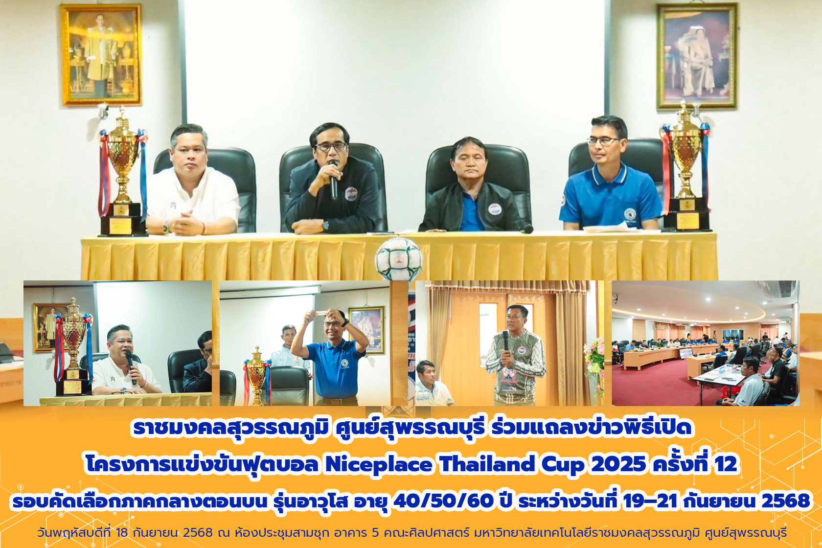 ราชมงคลสุวรรณภูมิ ศูนย์สุพรรณบุรี ร่วมแถลงข่าวพิธีเปิดโครงการแข่งขันฟุตบอล Niceplace Thailand Cup 2025 ครั้งที่ 12 | 281 ครั้ง เมื่อ 3 สัปดาห์ที่แล้ว