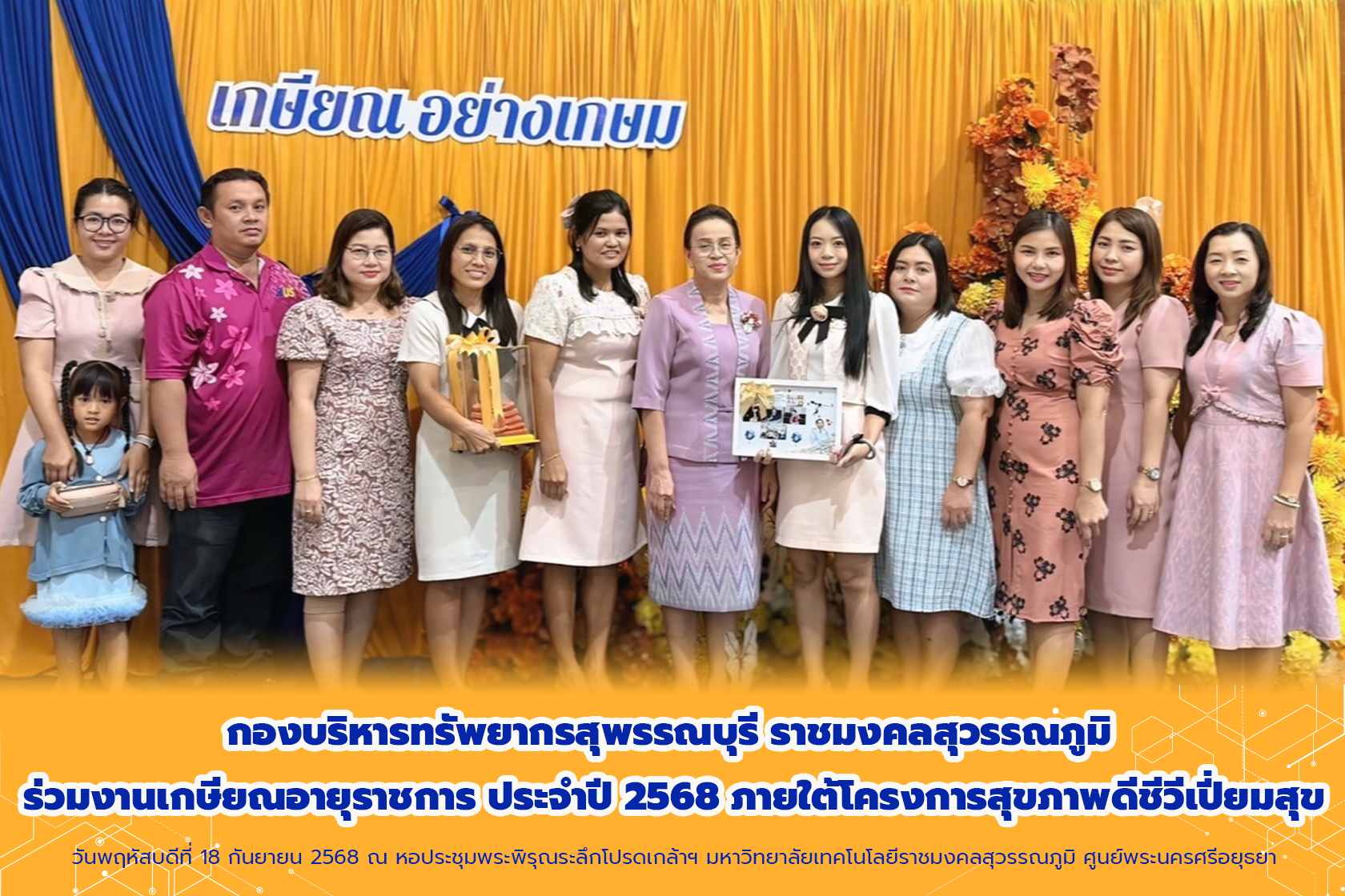 กองบริหารทรัพยากรสุพรรณบุรี ราชมงคลสุวรรณภูมิ ร่วมงานเกษียณอายุราชการ ประจำปี 2568 ภายใต้โครงการสุขภาพดีชีวีเปี่ยมสุข | 215 ครั้ง เมื่อ 3 สัปดาห์ที่แล้ว