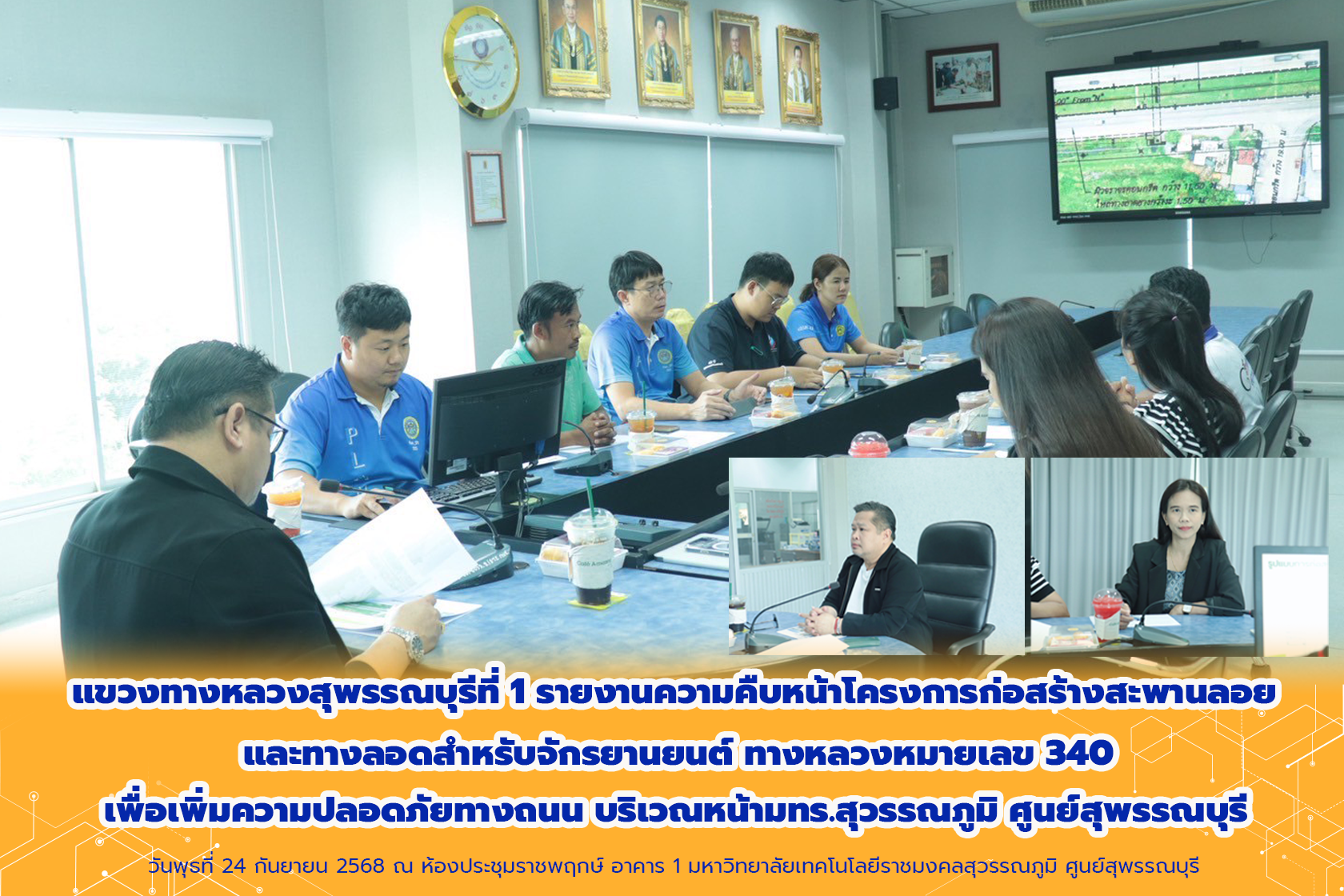 แขวงทางหลวงสุพรรณบุรีที่ 1 รายงานความคืบหน้าโครงการก่อสร้างสะพานลอยและทางลอดสำหรับจักรยานยนต์ ทางหลวงหมายเลข 340 เพื่อเพิ่มความปลอดภัยทางถนน บริเวณหน้า มทร.สุวรรณภูมิ ศูนย์สุพรรณบุรี | 256 ครั้ง เมื่อ 3 สัปดาห์ที่แล้ว