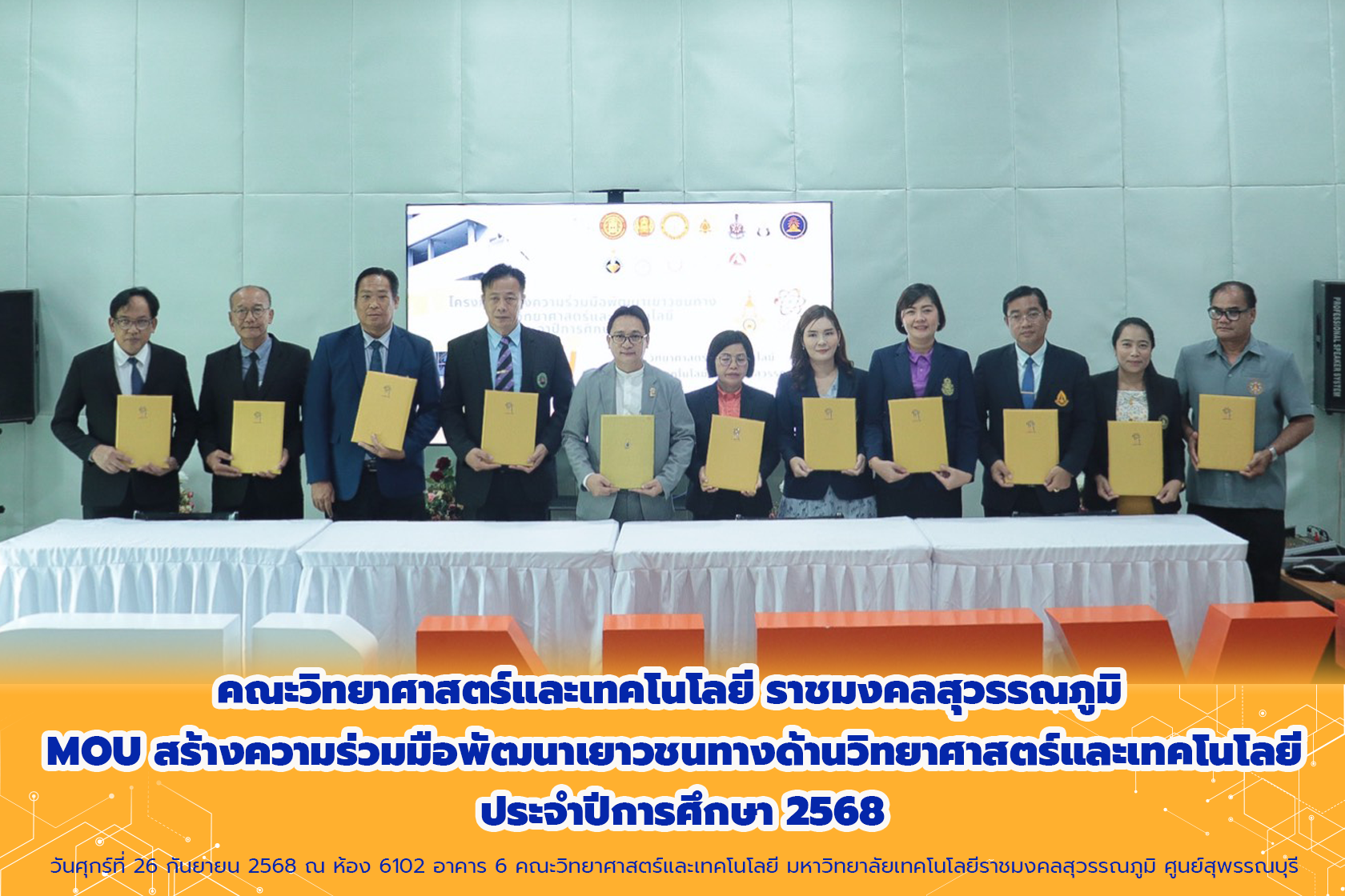 คณะวิทยาศาสตร์และเทคโนโลยี ราชมงคลสุวรรณภูมิ MOU สร้างความร่วมมือพัฒนาเยาวชนทางด้านวิทยาศาสตร์และเทคโนโลยี ประจำปีการศึกษา 2568 | 281 ครั้ง เมื่อ 2 สัปดาห์ที่แล้ว