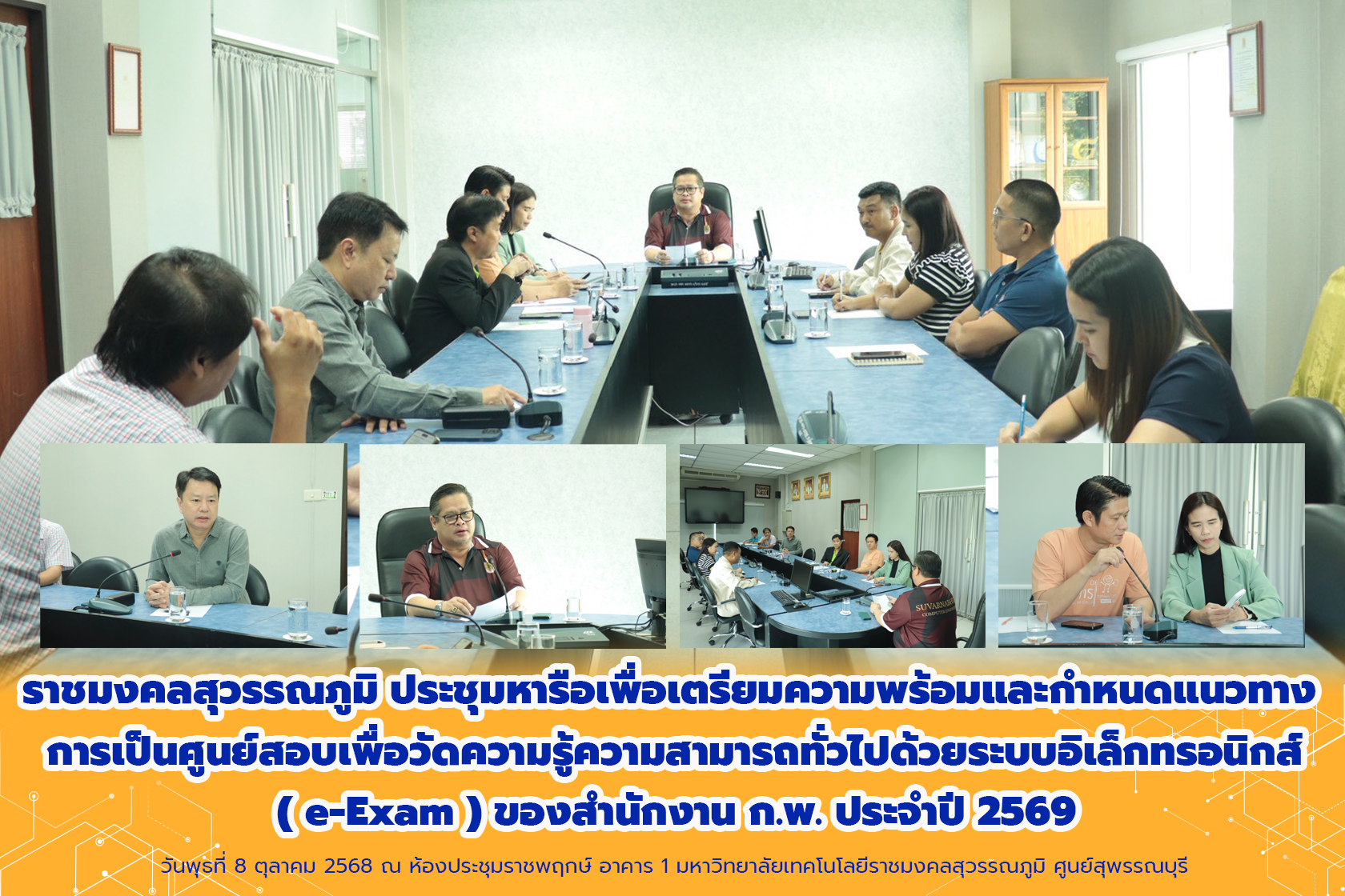 ราชมงคลสุวรรณภูมิ ประชุมหารือเพื่อเตรียมความพร้อมและกำหนดแนวทางการเป็นศูนย์สอบเพื่อวัดความรู้ความสามารถทั่วไปด้วยระบบอิเล็กทรอนิกส์ ( e-Exam ) ของสำนักงาน ก.พ. ประจำปี 2569 | 106 ครั้ง เมื่อ 1 สัปดาห์ที่แล้ว