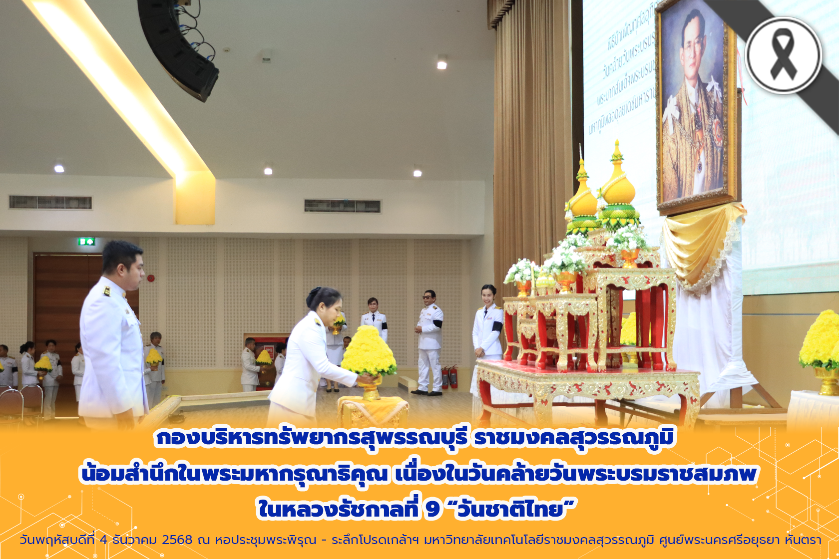 กองบริหารทรัพยากรสุพรรณบุรี ราชมงคลสุวรรณภูมิ ร่วมน้อมรำลึกในพระกรุณาธิคุณ กิจกรรมเนื่องในวันคล้ายวันพระราชสมภพ รัชกาลที่ 9 วันชาติ 5 ธันวาคม 2568 | 64 ครั้ง เมื่อ 2 วันที่แล้ว
