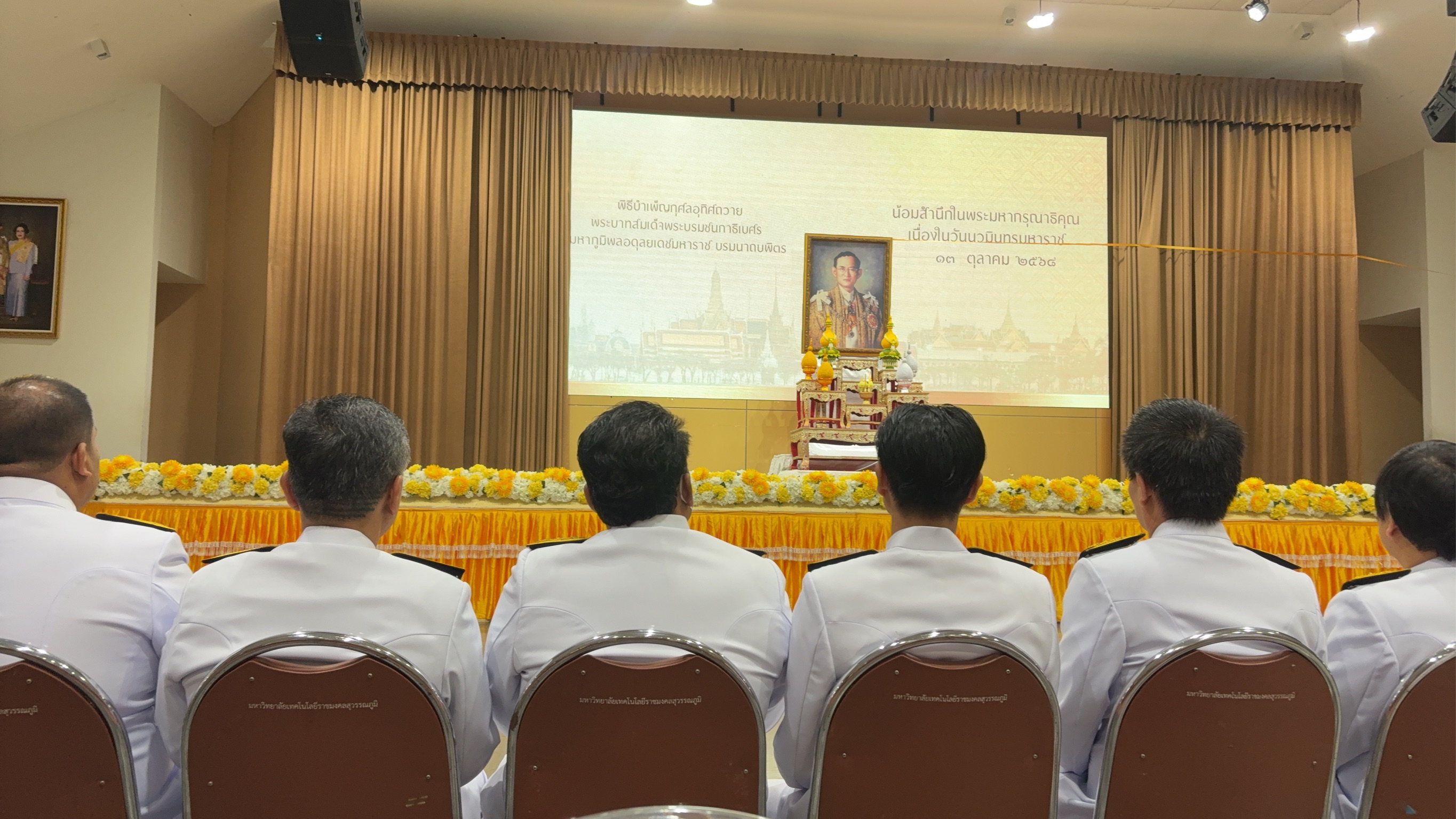 เมื่อวันพฤหัสบดีที่ 9 ตุลาคม 2568 รองศาสตราจารย์ ดร.ประมุข อุณหเลขกะ อธิการบดีมหาวิทยาลัยเทคโนโลยีราชมงคลสุวรรณภูมิ มอบหมายให้ ผู้ช่วยศาสตราจารย์ สัญญา คำจริง รองอธิการบดี เป็นประธานในพิธีน้อมสำนึกในพระมหากรุณาธิคุณ เนื่องในวัน “นวมินทรมหาราช” เพื่อแสดงความจงรักภักดี และรำลึกในพระมหากรุณาธิคุณอันหาที่สุดมิได้ของ พระบาทสมเด็จพระบรมชนกาธิเบศร มหาภูมิพลอดุลยเดชมหาราช บรมนาถบพิตร ภายในงานมีพิธีตักบาตรข้าวสารอาหารแห้ง เพื่อถวายเป็นพระราชกุศลแด่พระองค์ท่าน ผู้ทรงเป็นแรงบันดาลใจให้พสกนิกรชาวไทยมุ่งมั่นทำความดีเพื่อแผ่นดิน ทั้งนี้ นางธัญญารัตน์ สาริกา ผู้อำนวยการกองบริหารทรัพยากรสุพรรณบุรี ได้มอบหมายให้ นางสาวนิภาพร ทองรอด หัวหน้างานบริหารและพัฒนาระบบ พร้อม เจ้าหน้าที่ เข้าร่วมกิจกรรมดังกล่าว ณ หอประชุมพระพิรุณ–ระลึกโปรดเกล้าฯ มหาวิทยาลัยเทคโนโลยีราชมงคลสุวรรณภูมิ ศูนย์พระนครศรีอยุธยา หันตรา