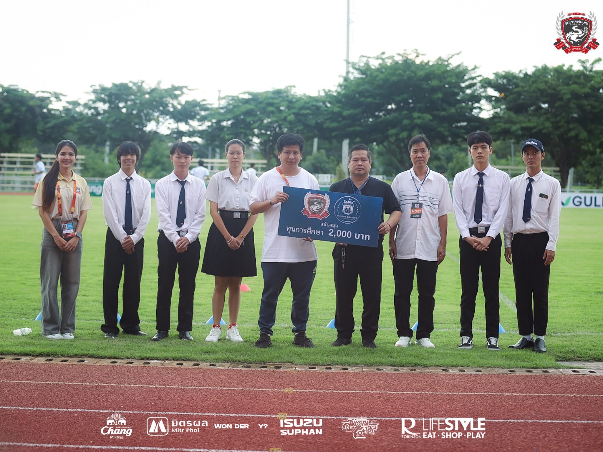วันอาทิตย์ที่ 12 ตุลาคม 2568 สโมสรสุพรรณบุรี เอฟซี ร่วมกับ เดอะวอล ซอคเกอร์ สปอร์ต ดิเวลลอปเม้นท์ เซ็นเตอร์ ได้ขอความอนุเคราะห์ใช้สนามกีฬามหาวิทยาลัยเทคโนโลยีราชมงคลสุวรรณภูมิ ศูนย์สุพรรณบุรี เพื่อจัดการแข่งขันฟุตบอล BYD DOLPHIN LEAGE lll 2025/26 พร้อมทั้งมอบทุนสนับสนุนการศึกษา จำนวน 5 ทุน ๆ ละ 2,000 บาท ให้แก่นักศึกษาของมหาวิทยาลัย โดยมี ดร.ณรงค์ศักดิ์ แสงป้อม รองอธิการบดีประจำศูนย์พื้นที่สุพรรณบุรี เป็นผู้รับมอบทุนการศึกษา พร้อมด้วย นักศึกษาที่ได้รับทุน ได้แก่ นายบริภัทร อุ่นคณฑี นักศึกษาคณะครุศาสตร์อุตสาหกรรม นางสาวปวริศา เสือใจหาญ นักศึกษาคณะบริหารธุรกิจและเทคโนโลยีสารสนเทศ นายเจษฎา พลสุจริต นักศึกษาคณะวิทยาศาสตร์และเทคโนโลยี นายณัฐวัตร เจริญรุ่งธนะวัฒน์ นักศึกษาคณะวิศวกรรมศาสตร์และสถาปัตยกรรมศาสตร์ และนายพิพัฒน์ ศรีเหรา นักศึกษาคณะศิลปศาสตร์ เพื่อส่งเสริมและสร้างโอกาสทางการศึกษา รวมถึงเป็นแรงบันดาลใจให้แก่นักศึกษาที่มีความมุ่งมั่นในการพัฒนาตนเองทั้งด้านวิชาการและกีฬา อีกทั้งยังสะท้อนถึงความร่วมมืออันดีระหว่างภาคการศึกษาและภาคกีฬาในการพัฒนาเยาวชนคนสุพรรณบุรีให้เติบโตอย่างมีคุณภาพ ณ สนามกีฬามหาวิทยาลัยเทคโนโลยีราชมงคลสุวรรณภูมิ ศูนย์สุพรรณบุรี ท่ามกลางบรรยากาศอบอุ่นและเป็นกันเอง สะท้อนให้เห็นถึงเจตนารมณ์ของสโมสรสุพรรณบุรี เอฟซี และ เดอะวอล ซอคเกอร์ สปอร์ต ดิเวลลอปเม้นท์ เซ็นเตอร์ ในการใช้กีฬาเป็นพลังขับเคลื่อนการศึกษาและสังคม