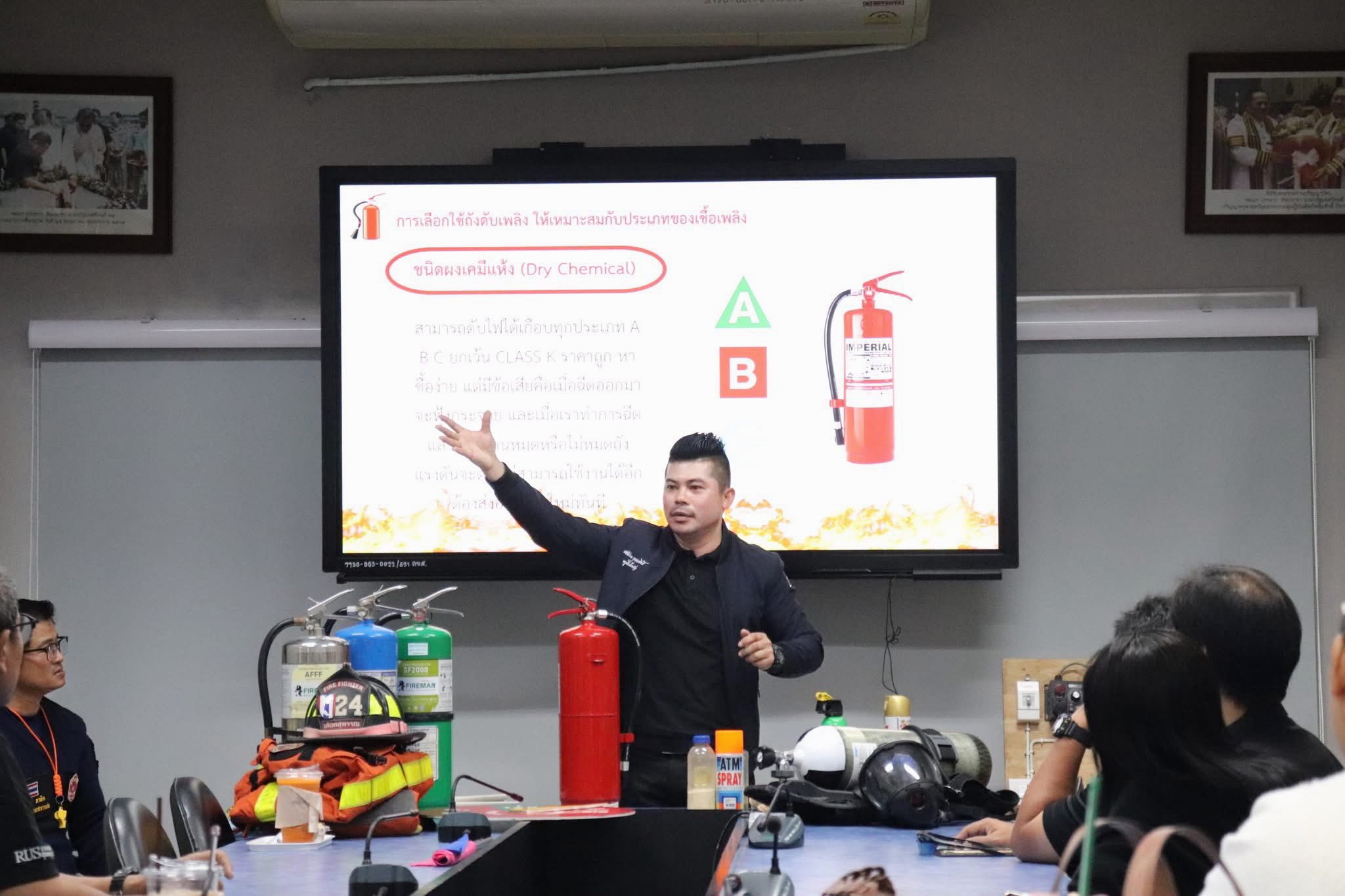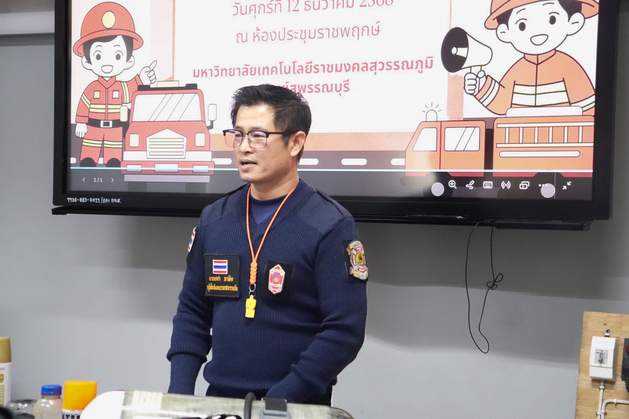 เมื่อวันศุกร์ที่ 12 ธันวาคม 2568 ดร.ณรงค์ศักดิ์ แสงป้อม รองอธิการบดีประจำศูนย์พื้นที่สุพรรณบุรี เป็นประธานเปิดโครงการอบรมฝึกดับเพลิงขั้นต้นและซ้อมอพยพหนีไฟ อาคาร 1 ศูนย์สุพรรณบุรี ภายใต้การดำเนินงานโครงการสำนักงานสีเขียว (Green Office) ประจำปี 2568 โดยมี นางธัญญารัตน์ สาริกา รักษาการผู้อำนวยการกองบริหารทรัพยากรสุพรรณบุรี พร้อมด้วย ผู้แทนคณาจารย์และเจ้าหน้าที่มหาวิทยาลัยเทคโนโลยีราชมงคลสุวรรณภูมิ ศูนย์สุพรรณบุรี เข้าร่วมอย่างพร้อมเพรียง โครงการดังกล่าวได้รับเกียรติจากทีมงานป้องกันและบรรเทาสาธารณภัย เทศบาลตำบลสามชุก อำเภอสามชุก จังหวัดสุพรรณบุรี เป็นวิทยากรบรรยายให้ความรู้และสาธิตการใช้อุปกรณ์ดับเพลิง รวมถึงฝึกปฏิบัติการอพยพหนีไฟ เพื่อเสริมสร้างความรู้ ความเข้าใจ และความพร้อมในการรับมือเหตุฉุกเฉินด้านอัคคีภัยอย่างถูกต้องและเป็นระบบ การจัดกิจกรรมมีวัตถุประสงค์เพื่อเสริมทักษะการดับเพลิงขั้นต้นให้บุคลากรสามารถปฏิบัติได้อย่างถูกต้องและปลอดภัย เตรียมความพร้อมในการอพยพหนีไฟเมื่อเกิดเหตุฉุกเฉินภายในอาคาร ส่งเสริมความตระหนักด้านความปลอดภัยในการทำงานและการใช้พื้นที่ภายในหน่วยงานและสนับสนุนการดำเนินงานตามเกณฑ์สำนักงานสีเขียว (Green Office) ให้มีประสิทธิภาพและยั่งยืน โครงการจัดโดยคณะกรรมการหมวด 5 ด้านสภาพแวดล้อมและความปลอดภัย โครงการสำนักงานสีเขียว (Green Office) ณ ห้องประชุมราชพฤกษ์ และบริเวณหน้าอาคาร 1 มหาวิทยาลัยเทคโนโลยีราชมงคลสุวรรณภูมิ ศูนย์สุพรรณบุรี