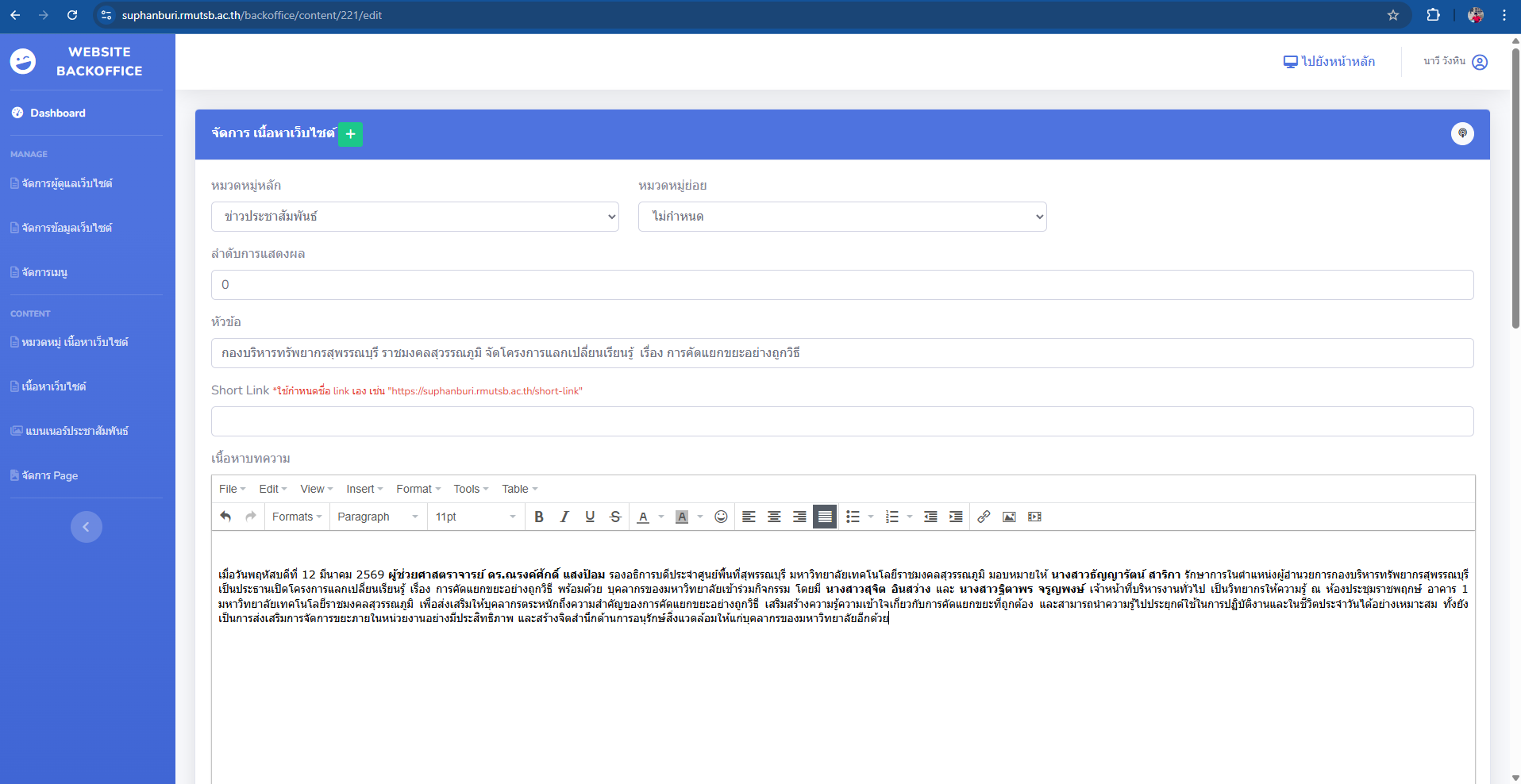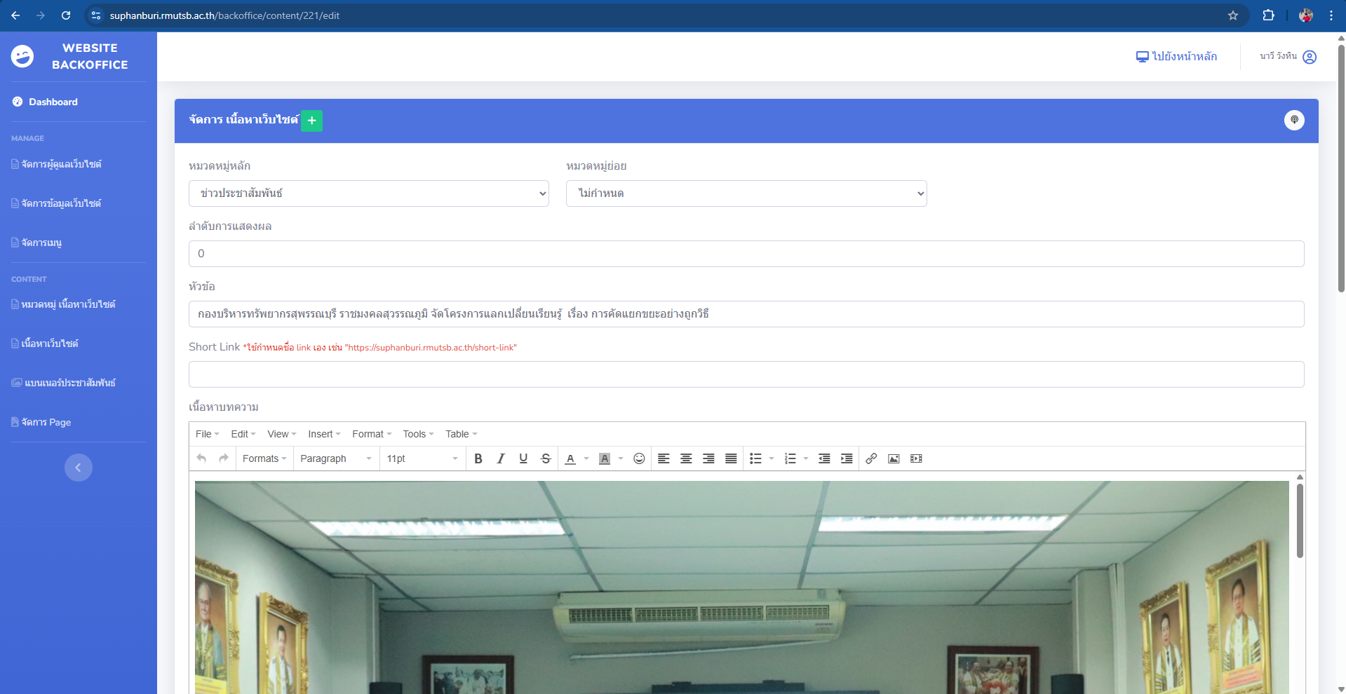 8.คลิกคำว่า หมวดหมู่หลัก เลือกคำว่า ประชาสัมพันธ์ ต่อด้วยเขียนหัวข้อข่าวในช่องคำว่า หัวข้อ