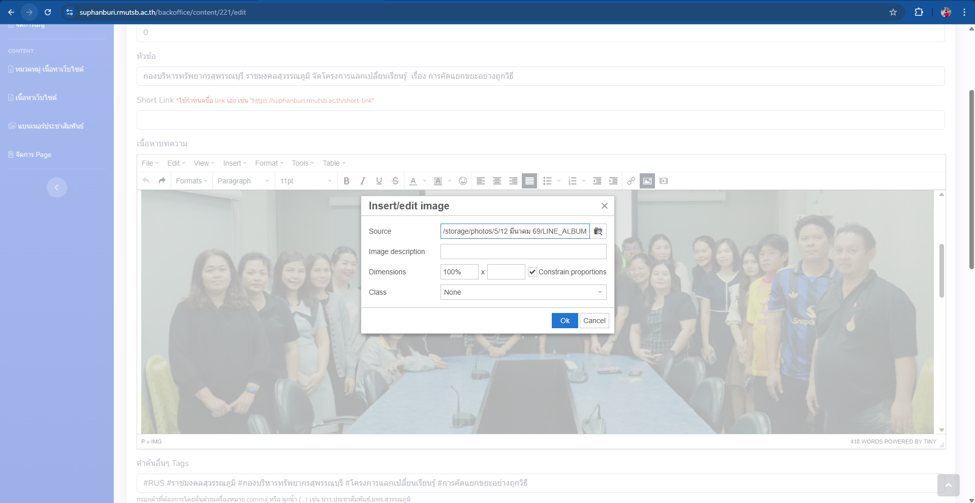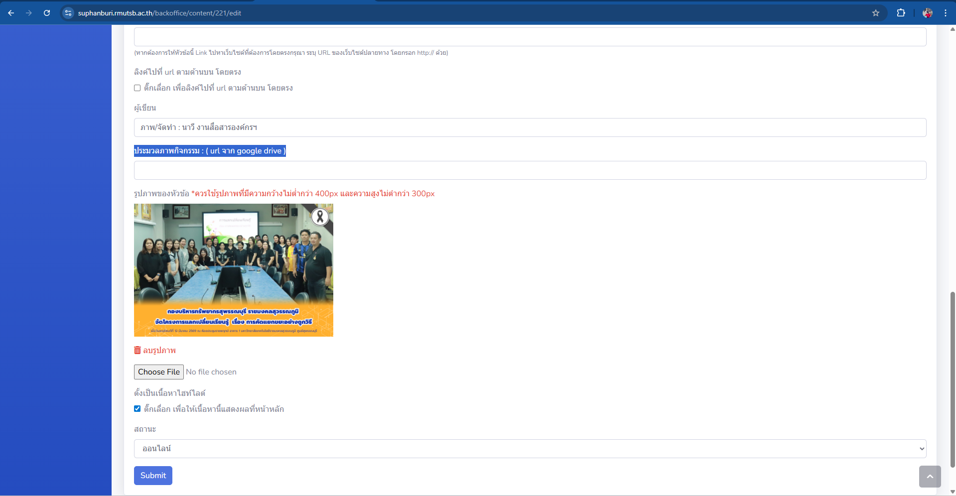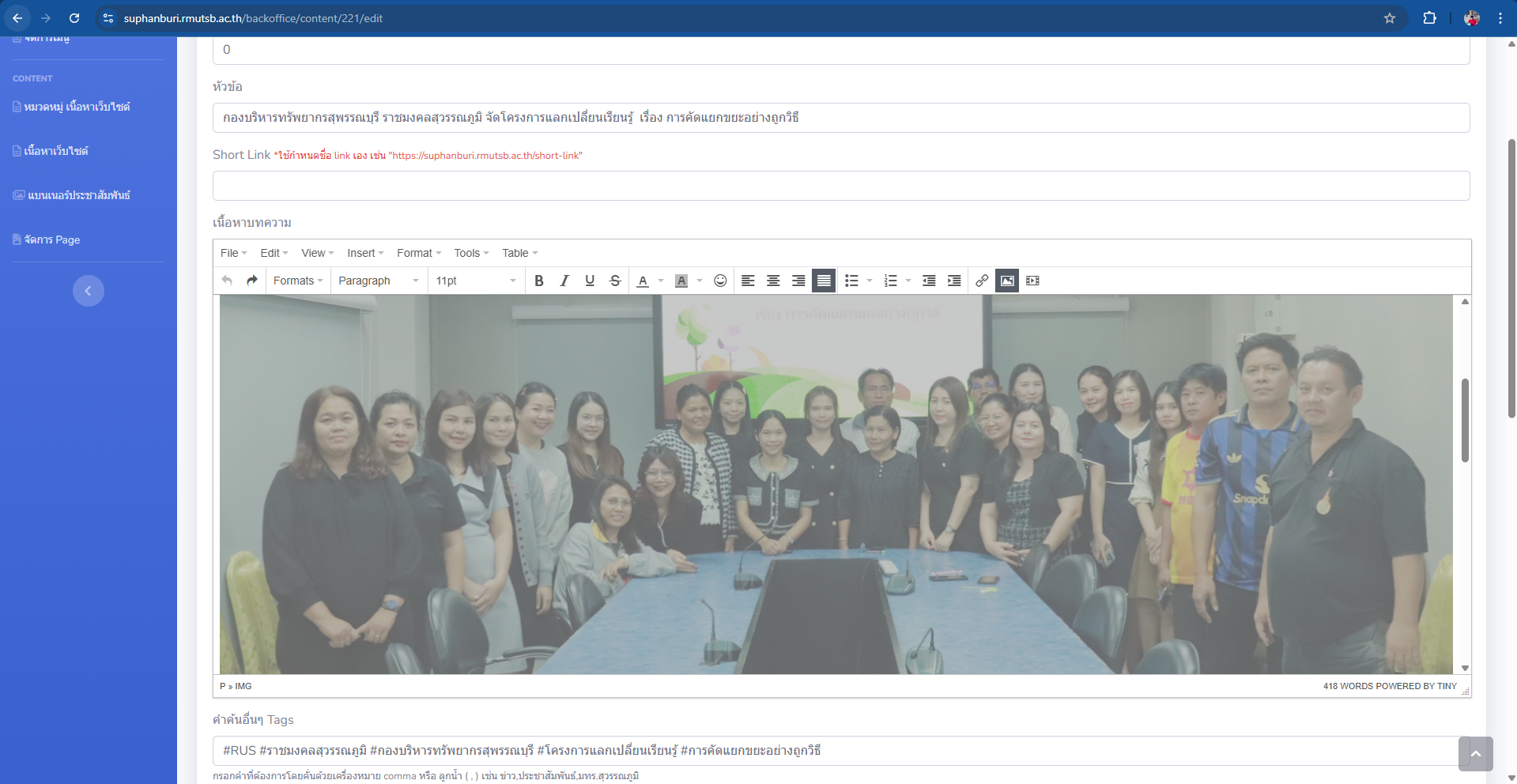 15.เพิ่มข้อความในช่องคำว่า คำค้นอื่นๆ Tags ต่อด้วยคำว่า ผู้เขียน ประมวลภาพกิจกรรม : ( url จาก google drive ) และสุดท้ายคลิกเพิ่มรูปคำว่า Choose file